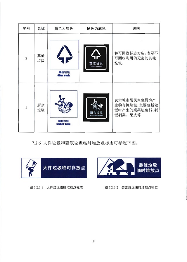 4.1.6新建小區(qū)和有條件的既有小區(qū)宜在合適區(qū)域設置裝修垃圾、大 件垃圾、綠化垃圾等收集點,收集點應建有層G不低于3米封閉構(gòu)筑物, 并設置明顯標志,面積不小于30平方米。進出通道應滿足車輛G度、寬度 等通行條件;大件垃圾收集點宜結(jié)合裝修垃圾收集點合并設置。既有小區(qū) 應根據(jù)實際情況,指定裝修垃圾、大件垃圾、綠化垃圾等臨時分類堆放場 所,并設置明顯標志。