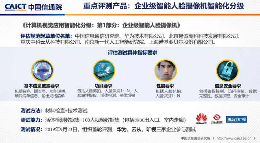 測試情況:2019年9月23日,組織輪評測,華為、云從、曠視三家企業參與測試。