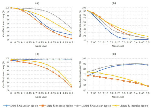 圖4中,灰線和藍線分別代表LISNN和沒有側向作用的SNN在添加了G斯噪聲的測試集上的準確率;黃線和橙線分別代表LISNN和沒有側向作用的SNN在添加了脈沖噪聲的測試集上的準確率。在大部分情況下,LISNN的性能損失都小于沒有側向作用的SNN,尤其是在訓練集中沒有添加噪聲數據的情況下。
