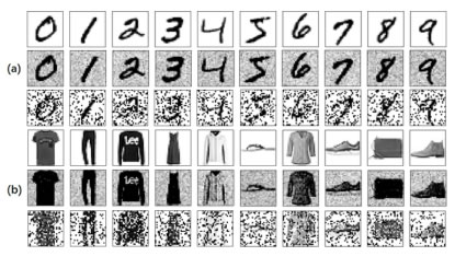 (b)三行依次為原始Fashion MNIST測試集圖片、加入G斯噪聲后的圖片、加入脈沖噪聲后的圖片