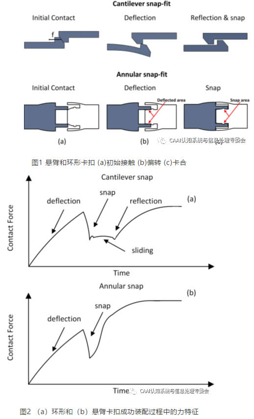 零件在不同的裝配階段產生的作用力可用于描述過程狀態(tài)。圖2所示的兩種卡扣的力特征圖具有不同的形狀,可用于及時識別裝配過程的完成情況。在這兩種情況下,物體的偏轉都會產生一個恒定的力,一旦部件的力消失,力就會急劇下降,當兩部分鎖定在一起時,力就會增大。懸臂卡扣在鎖定之前,兩個部件相互滑動,產生一個恒定的摩擦力,該摩擦力由于部件的材質屬性造成的力載荷不同而變化。環(huán)形卡扣則不存在滑動。力信號的確切形狀取決于連接部件的機械性能和卡扣類型。環(huán)形和懸臂是兩個J端情況,環(huán)形卡扣是在恒定的力載荷下,而懸臂卡扣在咬合后載荷消失。