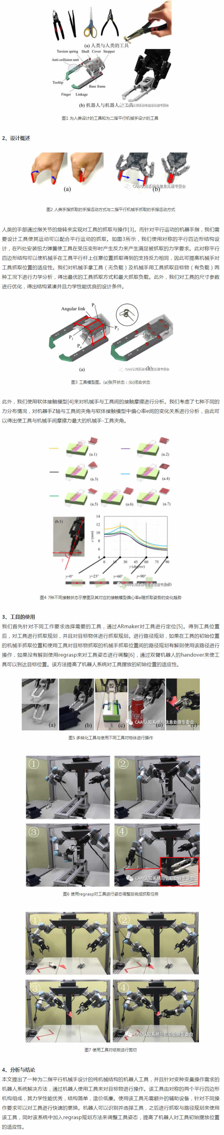 現(xiàn)代自動化生產(chǎn)中要求機器人系統(tǒng)具備一定柔性以適應變種變量的生產(chǎn)需求。例如在機器人分揀及組裝中,機器人需要快速處理各式不同的物體。使機器人系統(tǒng)可以穩(wěn)定并且低成本的操控多種目標物體是實現(xiàn)新一代G效自動化生產(chǎn)的重要研究目標。目前機器人系統(tǒng)針對多種物體的操作,主要通過機械手/手指更換設備或多功能機械手來實現(xiàn)[1][2]。然而機械手/手指更換設備需要部署輔助控制設備和外部能源供給,這增加了系統(tǒng)的復雜度。同時,設備的控制與供能需要引入電纜或氣管,這會對機械臂的自由靈活運動產(chǎn)生干擾。此外,多功能機械手僅可適用于一定范圍的操作任務。對此,我們提出了讓機器人使用不同工具來操作多樣化目標物的方法。這里提到的工具并不是機器人學中對終端執(zhí)行器的稱呼,而是同人類使用的鑷子,剪刀等工具一樣的可以被機械手直接控制的工具。此工具為復雜的變種變量的操作任務提供了一項有效的解決方案,它有如下特征:(1) 通過機械機構(gòu)實現(xiàn)機械手到工具的動力傳遞,無需外部控制及供能;(2)結(jié)構(gòu)緊湊,對機器人的避障路徑規(guī)劃影響J小;(3) 通過設計不同的工具先端實現(xiàn)可以對多種任務進行有效配適,在更換工具時僅需要對目標工具進行一次抓取;(4)純機械機構(gòu)設計,成本低廉,可靠性強。