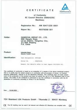 近日,杭叉集團股份有限公司(以下簡稱杭叉集團)的無人駕駛工業車輛(AGV)產品獲得了符合2006/42/EC歐盟機械指令和ISO 3691-4國際標準的無人駕駛工業車輛CE證書,這是自ISO3691-4標準實施以來萊茵頒發的國內首張無人駕駛工業車輛CE證書,標志著杭叉集團AGV車輛的制造和設計達到國際先進水平。