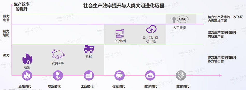 人類文明演進(jìn)依次走過了原始時(shí)代、農(nóng)業(yè)時(shí)代、工業(yè)時(shí)代、信息時(shí)代、數(shù)字時(shí)代,到今天的數(shù)智時(shí)代,每個(gè)時(shí)代的代表性生產(chǎn)工具都不同。所有 生產(chǎn)工具反映的都是生產(chǎn)效率的提升能力。數(shù)字時(shí)代的云、網(wǎng)、端、芯、鏈等數(shù)字工具,除了體力效率的提升之外,還有腦力效率的輔助作用, ChatGPT所代表的AIGC工具的出現(xiàn),標(biāo)志著人類生產(chǎn)效率出現(xiàn)了D二次腦力效率飛躍,是新一輪生產(chǎn)力的躍遷,真正實(shí)現(xiàn)從體力效率提升向腦力 效率提升的轉(zhuǎn)變,這將推動(dòng)人類社會(huì)發(fā)生深遠(yuǎn)變革,其意義不亞于新時(shí)代的蒸汽機(jī)。