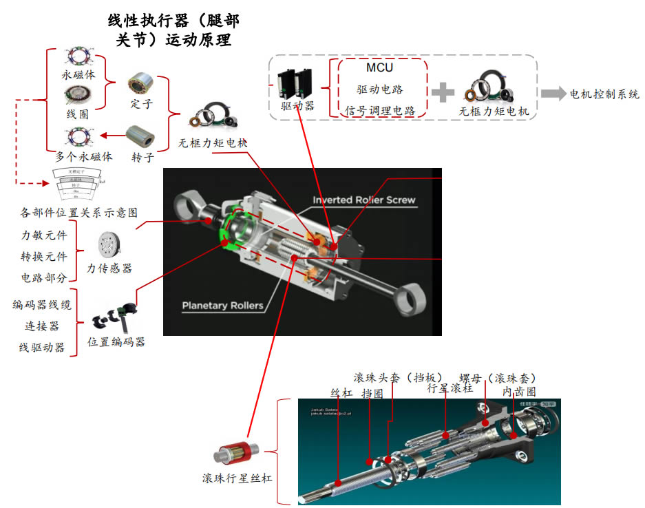 線性執(zhí)行器:位于膝肘等單自由度及腕踝等雙自由度關(guān)節(jié),將電機旋轉(zhuǎn)運動轉(zhuǎn)為直線運動