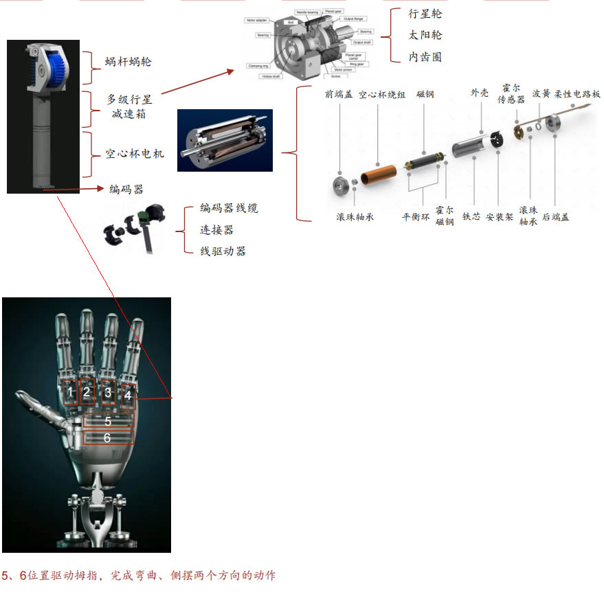 旋轉執行器分布于肩部、手部等多自由度關節,作用是將某物旋轉到一定角度完成旋轉運動;驅動關節完成旋轉動作,減速器為核心部件