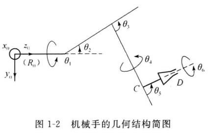 機(jī)械手是具有傳動(dòng)執(zhí)行裝置的機(jī)械,它由臂、關(guān)節(jié)和末端執(zhí)行裝置(工具等)構(gòu)成,組合為一個(gè)互相連接和互相依賴的運(yùn)動(dòng)機(jī)構(gòu)。機(jī) 械手用于執(zhí)行指定的作業(yè)任務(wù)。不同的機(jī)械手 具有不同的結(jié)構(gòu)類型。圖1-2給出機(jī)械手的幾何 結(jié)構(gòu)簡(jiǎn)圖。機(jī)械手又稱為操作機(jī)、機(jī)械臂或操 作手。大多數(shù)機(jī)械手是具有幾個(gè)自由度的關(guān)節(jié) 式機(jī)械結(jié)構(gòu), 一般具有六個(gè)自由度。其中,頭 三個(gè)自由度引導(dǎo)夾手裝置至所需位置,而后三 個(gè)自由度用來決定末端執(zhí)行裝置的方向。