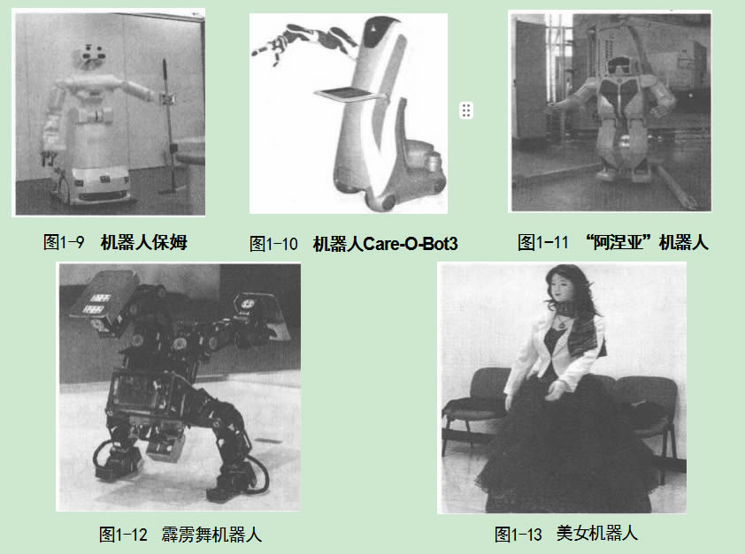 如圖1-9所示的機(jī)器人是日本發(fā)明出的人形個(gè)性機(jī)器人保姆 “ar”,“ar” 上共搭載了五 臺(tái)照相機(jī),通過(guò)圖像識(shí)別來(lái)辨認(rèn)家具,它依靠車輪移動(dòng),除了會(huì)洗衣,打掃衛(wèi)生,還會(huì)收拾 餐具等諸多家務(wù)雜活。在公開(kāi)展示活動(dòng)中, “ar” 演示了打開(kāi)洗衣機(jī)蓋并將衣服放入洗衣機(jī) 的過(guò)程,同時(shí)還展示了送餐具和打掃衛(wèi)生等功能。
