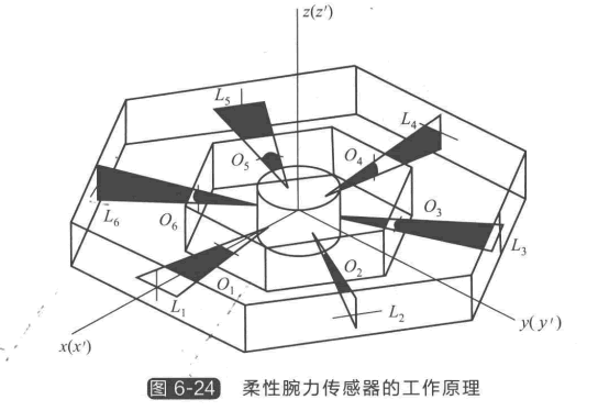 柔性腕力傳感器的工作原理如圖6-24所示,柔性腕力傳感器的內環相對于外環的位置 和姿態的測量采用非接觸式測量。傳感元件由6個均布在內環上的紅外發光二極管 (LED) 和6個均布在外環上的線型位置敏感元件 (PSD) 構成。PSD 通過輸出模擬電流信號來反映 照射在其敏感面上光點的位置,具有分辨率高、信號檢測電路簡單、響應速度快等優點。