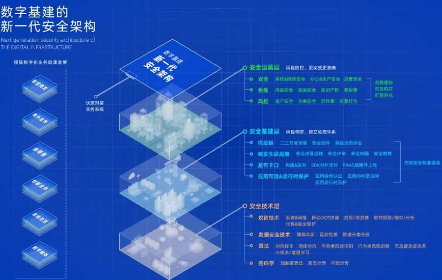 在“安全基建”概念中,新架構整合阿里安全能力和運營經驗,形成一套即插即用的標準化安全架構,為各類 App 和網站等數字經濟實體的搭建過程建立標準化流程,幫助構建數字化進程中的安全基礎設施。&