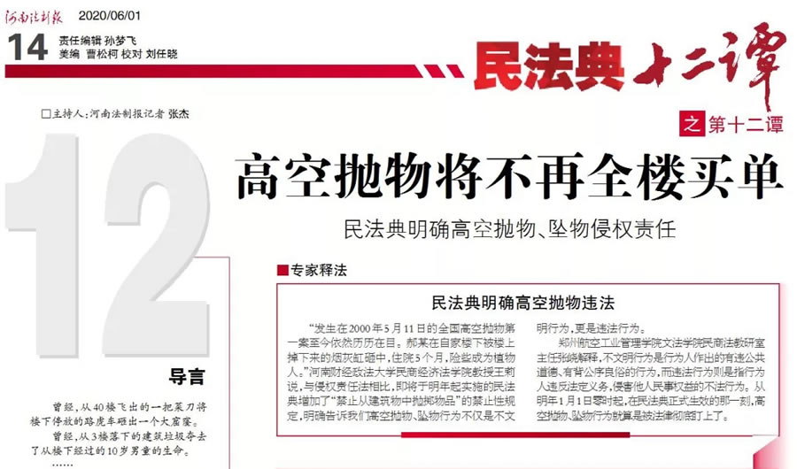 “發(fā)生在2000年5月11日的全國G空拋物D一案至今依然歷歷在目。郝某在自家樓下被樓上掉下來的煙灰缸砸中,住院5個月,險些成為植物人。”河南財經(jīng)政法大學(xué)民商經(jīng)濟法學(xué)院教授王莉說,與侵權(quán)責任法相比,即將于明年起實施的民法典增加了“禁止從建筑物中拋擲物品”的禁止性規(guī)定,明確告訴我們G空拋物、墜物行為不僅是不文明行為,更是違法行為。