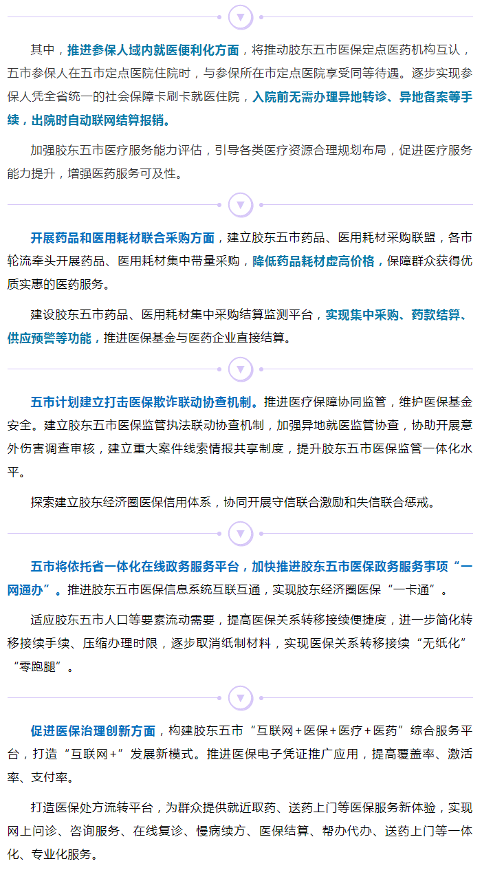 《行動方案》是在山東省醫(yī)保局指導(dǎo)下,由青島、煙臺、威海、濰坊、日照五市醫(yī)保局會商共同制定。《行動方案》明確,通過構(gòu)建“就醫(yī)服務(wù)便捷、藥械采購協(xié)同、醫(yī)藥產(chǎn)業(yè)集聚、打擊騙保聯(lián)動、信息互通共享”的膠東五市醫(yī)保發(fā)展共同體,促進(jìn)五市醫(yī)保政策更加均衡,醫(yī)保服務(wù)更加便捷,醫(yī)藥價(jià)格更加優(yōu)惠,全力支持和服務(wù)膠東經(jīng)濟(jì)圈一體化發(fā)展大局。