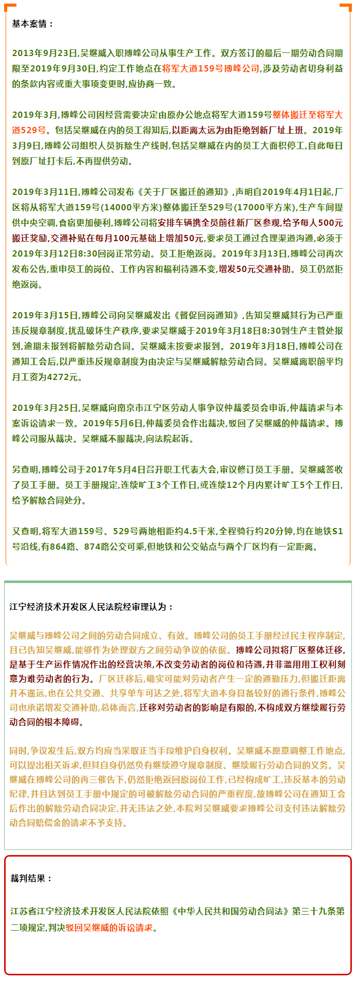 案例要旨:用人單位整體搬遷導致勞動者工作地點變更、通勤時間延長的,是否屬于《中華人民共和國勞動合同法》第四十條第三項規定的“勞動合同訂立時所依據的客觀情況發生重大變化,致使勞動合同無法履行”的情形,需要考量搬遷距離遠近、通勤便利程度,結合用人單位是否提供交通工具、是否調整出勤時間、是否增加交通補貼等因素,綜合評判工作地點的變更是否給勞動者的工作和生活帶來嚴重不便并足以影響勞動合同的履行。如果用人單位已經采取適當措施降低了搬遷對勞動者的不利影響,搬遷行為不足以導致勞動合同無法履行的,勞動者不得以此為由拒J提供勞動。