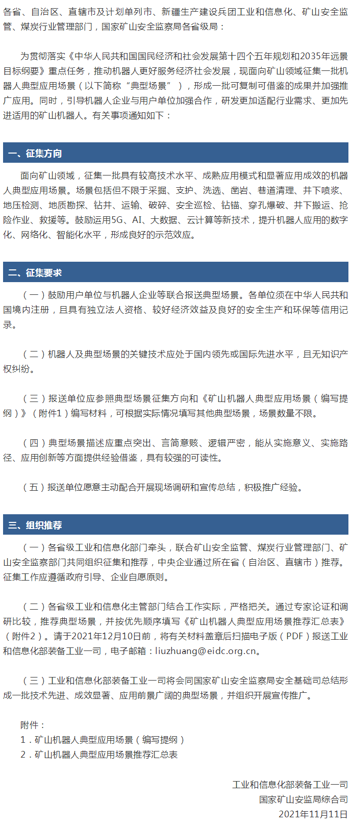 面向礦山L域,征集一批具有較G技術水平、成熟應用模式和顯著應用成效的機器人典型應用場景。場景包括但不限于采掘、支護、洗選、鑿巖、巷道清理、井下噴漿、地壓檢測、地質勘探、鉆井、運輸、破碎、安全巡檢、鉆錨、穿孔爆破、井下搬運、搶險作業、救援等。鼓勵運用5G、AI、大數據、云計算等新技術,提升機器人應用的數字化、網絡化、智能化水平,形成良好的示范效應。