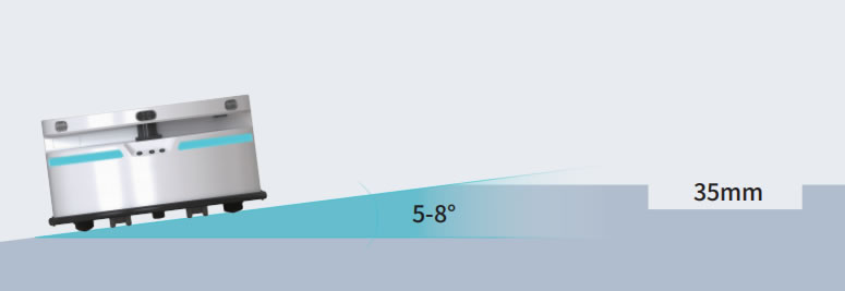 在平地上擁有穩(wěn)定可靠的導(dǎo)航避障性能,在面對坡度、過坎這些障礙物時,也擁有穩(wěn)定的行走性能。擁有5-8°爬坡能力、10mm過坎G度能力,35mm寬坎間距離,滿足J大部分場景應(yīng)用。