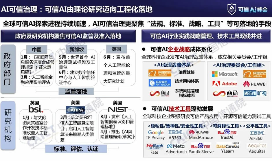 可信AI由理論研究邁向工程化落地。隨著人工智能技術的快速發展,社會各界對可信AI研究已經從理論探索逐步走向工程化落地實踐。政府與研究機構相關政策和規范從宏觀指導,開始向可操作、可落地的規范演進。在法律監管層面,各政府部門的法規政策愈發重視實施和操作。例如新加坡于5月出臺世界AI治理測試框架及工具包;英國6月宣布人工智能倫理和監管的重大研究計劃。