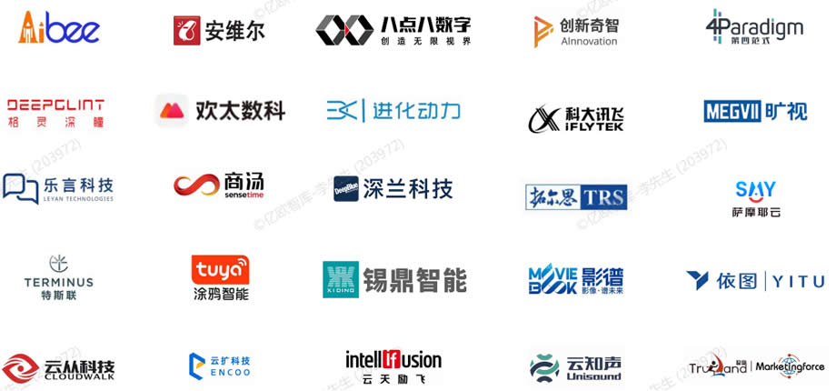 商湯科技,優(yōu)必選,科大訊飛,深蘭科技,影譜科技,依圖科技,曠視,云從科技,創(chuàng)新奇智,影創(chuàng)科技,進化動力,百應,靈犀,數(shù)美科技,雙太數(shù)科,飛步科技