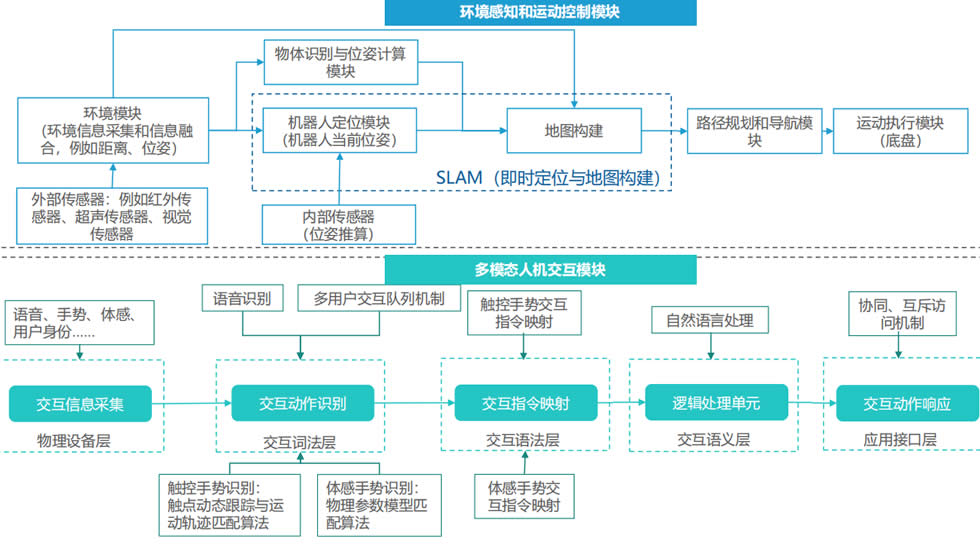 環(huán)境感知與導(dǎo)航是指機器人通過傳感器獲取外界環(huán)境及自身信息;運動控制器是服務(wù)機器人行動的執(zhí)行者;人機交互技術(shù)是實現(xiàn)服務(wù)機器 人與人溝通的橋梁