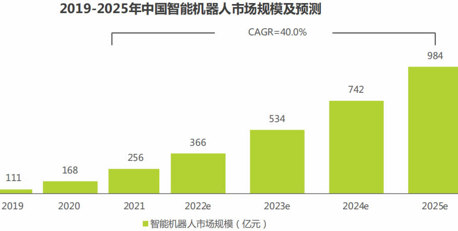 力及勞動力的旺盛需求,整個機器人產(chǎn)業(yè)呈現(xiàn)健康走勢。艾瑞預(yù)測,2025年中國智能機器人市場規(guī)模接近千億。相較于